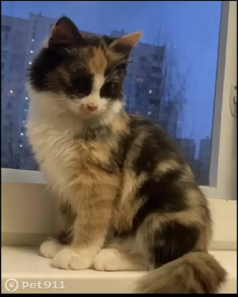 Пушистая и небольшая кошка,трёхцветная бело-ч...