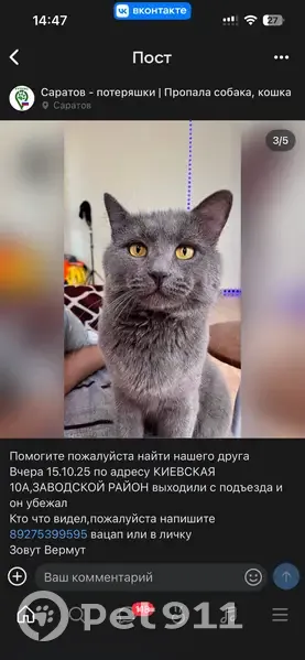 Пропал домашний кот 12 октября,г. Саратов, За...