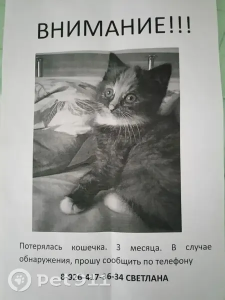 Пропала трехшерстная кошечка 3 месяца.На голо...