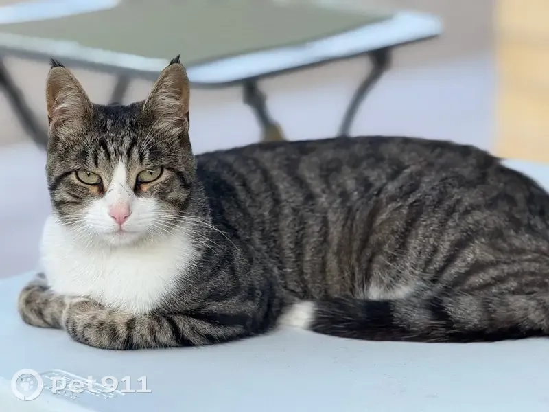 серый окрас, тигровый, белое пятно на левом б...