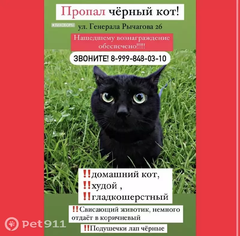 Кошки потеряшки, Москва, фото: Потеряшка черный кот на ул. Ген. Рычагова 26, Москва