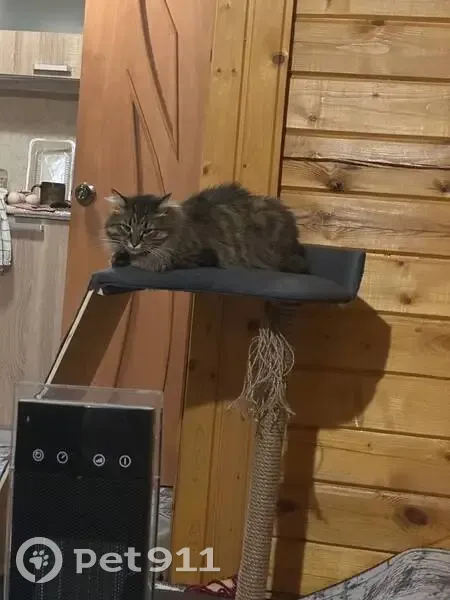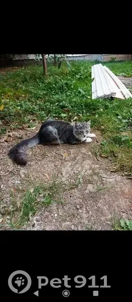 Очень пушистый, окрас серо-чёрный. На шее был...
