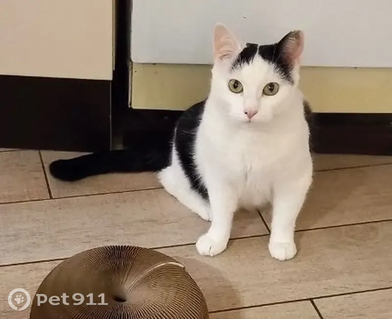 Бело-черная кошка, мяукает очень тихо, сбежал...