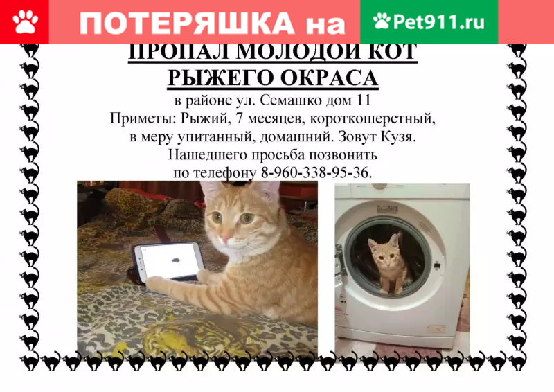 ПРОПАЛ МОЛОДОЙ КОТ РЫЖЕГО ОКРАСА в районе ул....