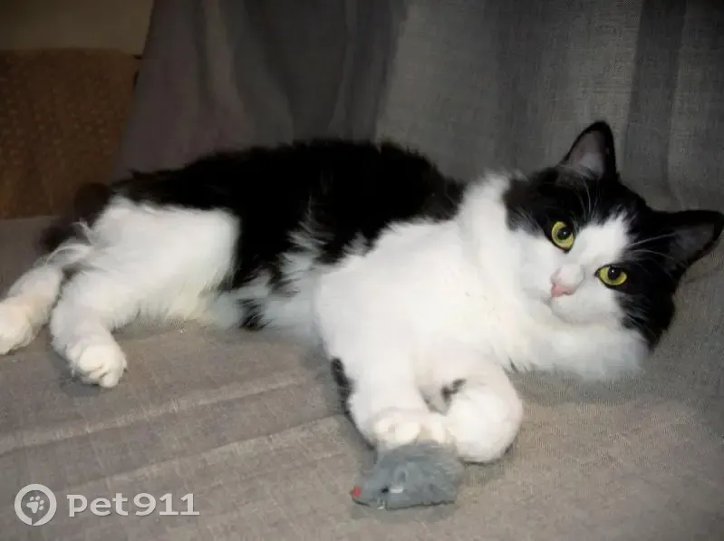 Окрас чëрно-белый, пушистый, упитаный. Вышел...