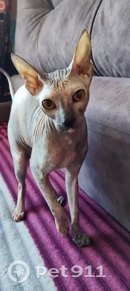 Сфинкс, серый, пушистые лапки. Голубые глаза.