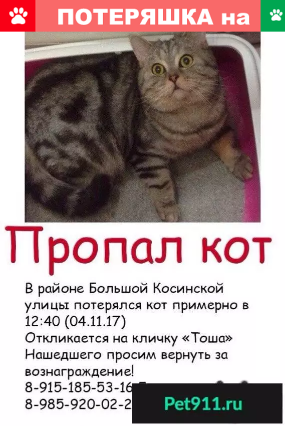 Пропал кот 04. 11. 2017 года, в районе Косино...