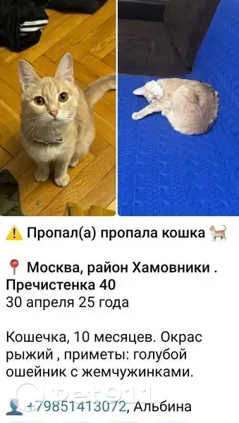 Кошки потеряшки, Москва, фото: Потеряшка рыжая кошка, Пречистенка 40/2с3