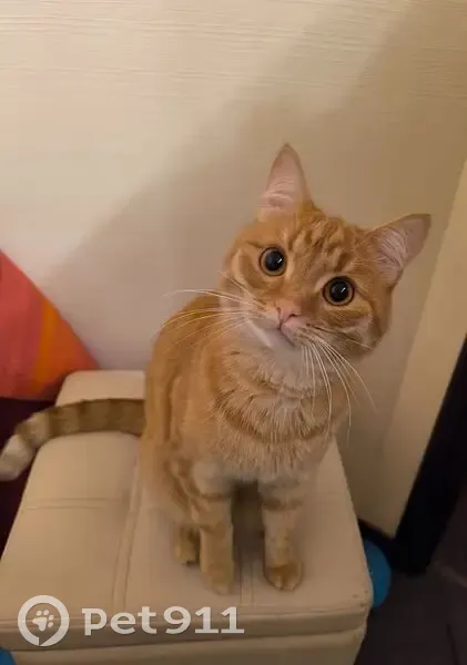 Рыжий, домашний. Отзывается на кличку. Ошейни...