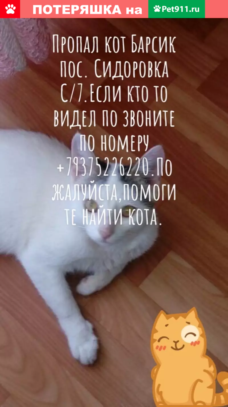 Пропал кот Барсик пос. Сидоровка С/7.Если кто...