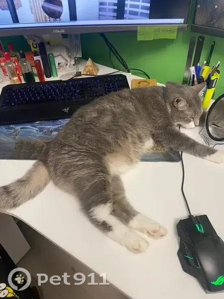 Кот серый с белыми пятнами, пушистый. Кличка...
