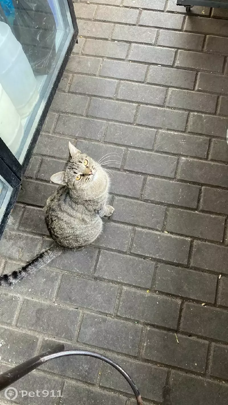 Кот серый в полоску, был желтый ошейник, есть...