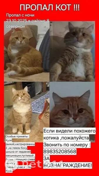 Потерялся кот.Окрас рыжий, маленькое пятно на...