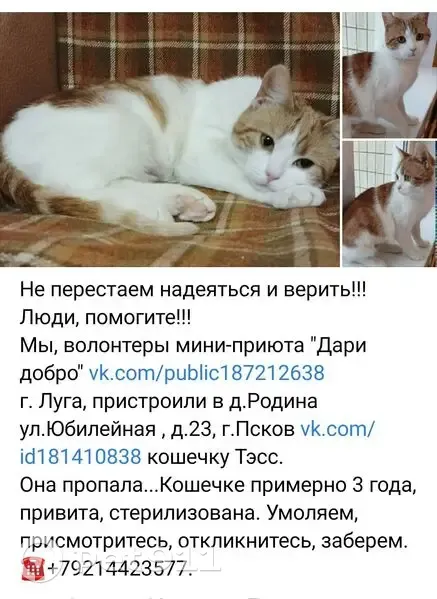 Кошки потеряшки, Амосово, фото: Потеряшка кошка, Амосово, Псковская область - рыжая с белым