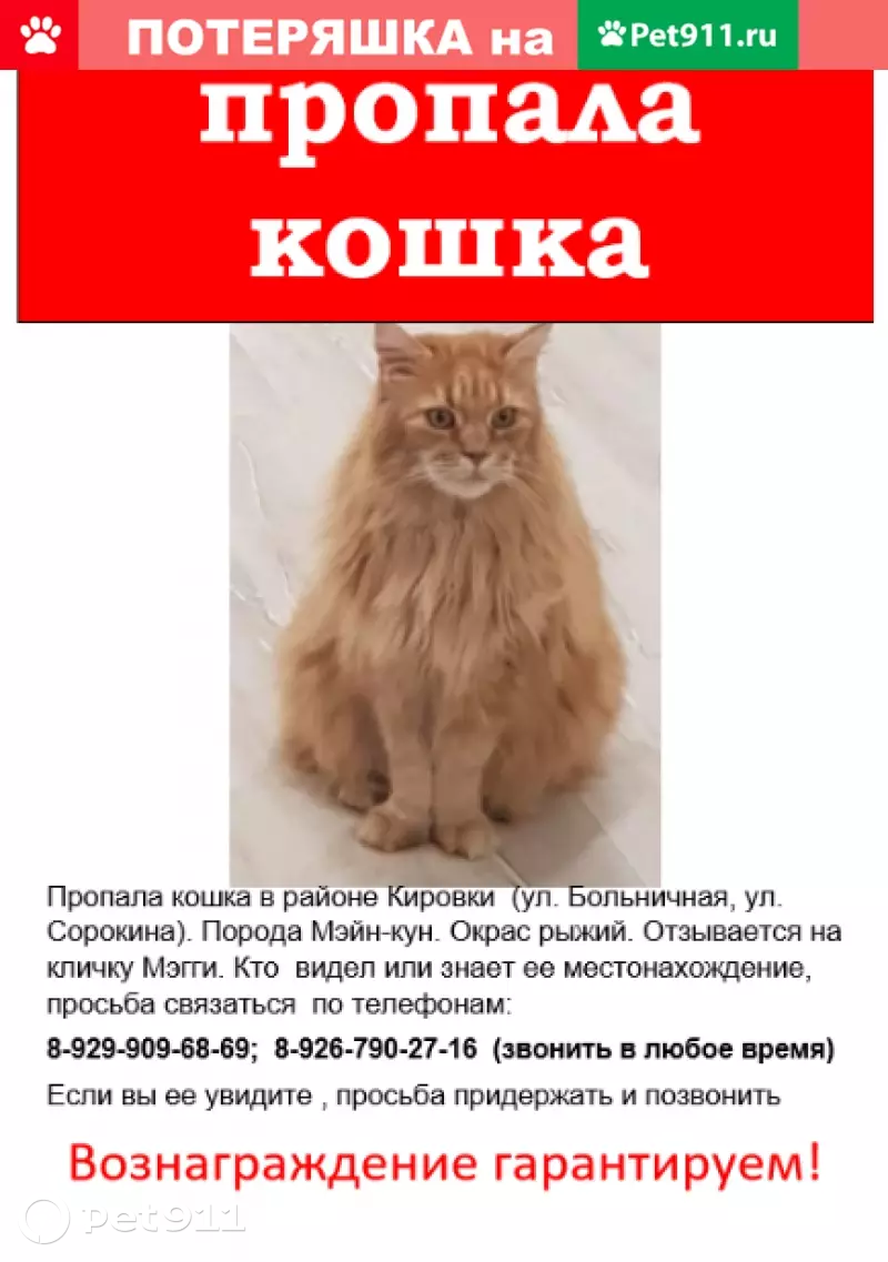 Пропала кошка мэйн кун, вознаг...