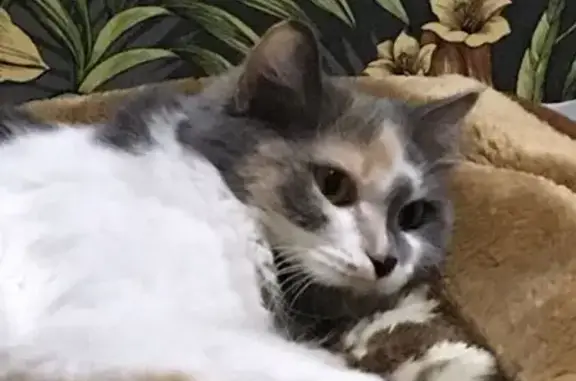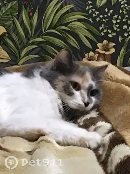 Трехцветная кошка, пушистая, яркая, живот и л...