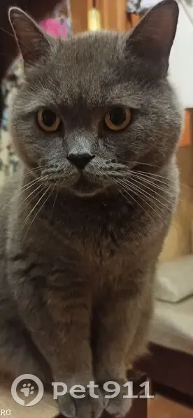 Окрас: тёмно-серый, глаза жёлтые. Черты брита...