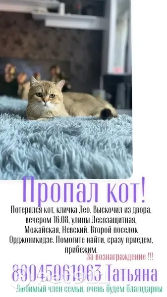 У нас убежала кошка, любимица семьи — Лея. Мы...