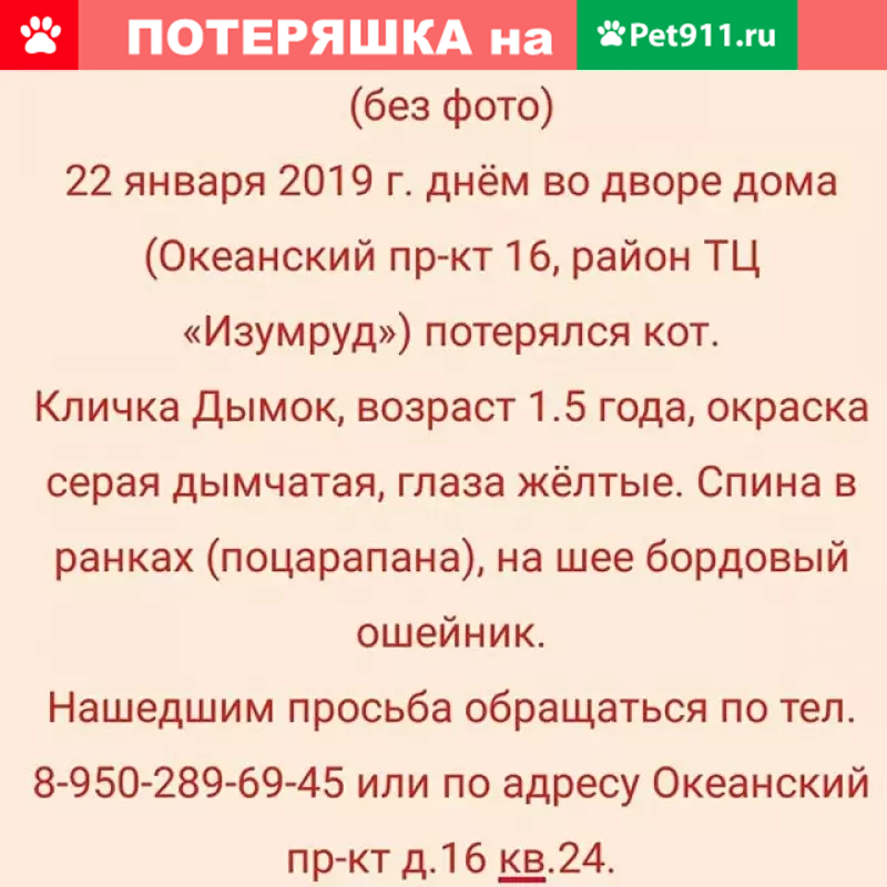 Приморье!!! Внимание! Пропал кот!!! Потерялся...
