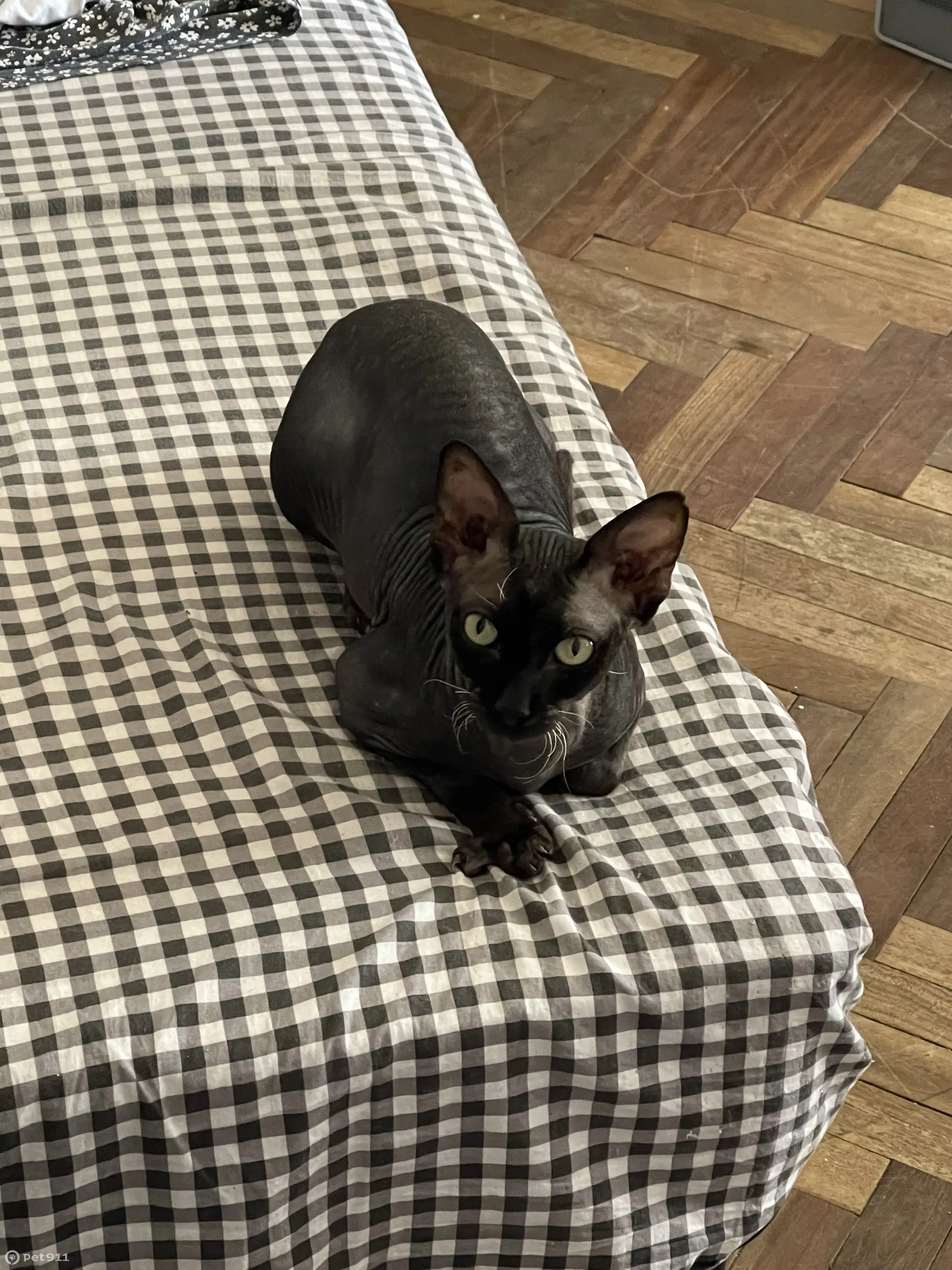 Черный лысый кот порода сфинк, зовут феня, мо...