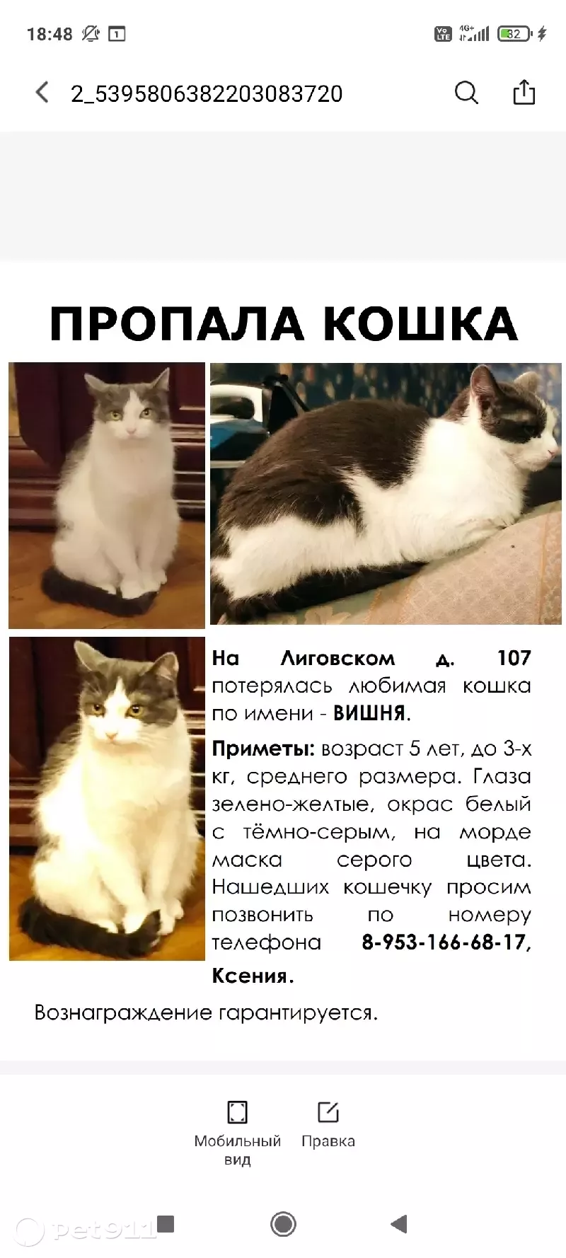 Пропала кошка Вишня, Лиговский...