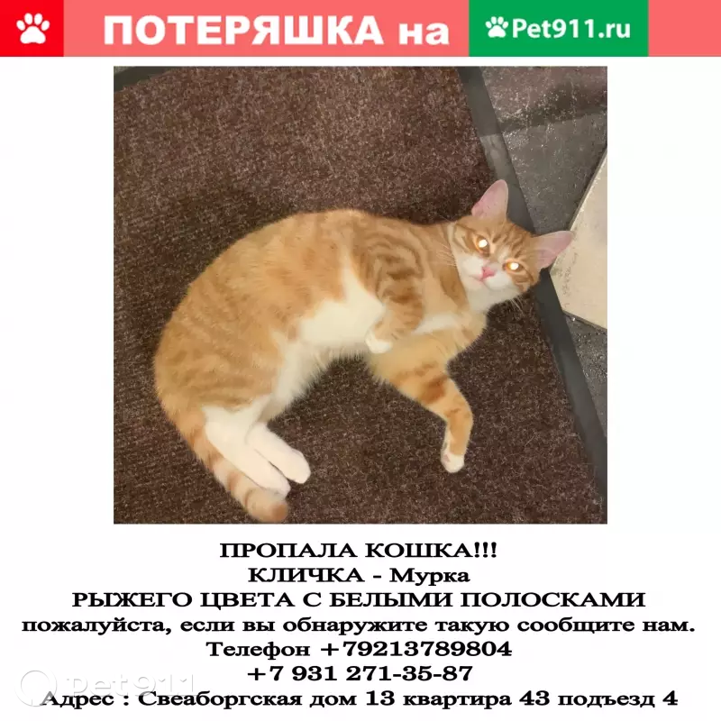 Пропала кошка на Свеаборгской,...