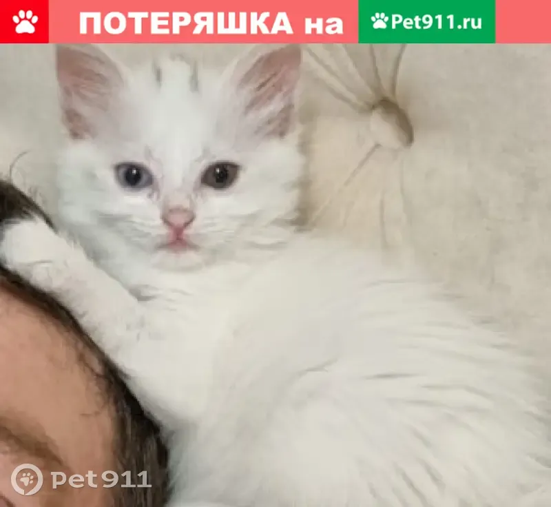 Кошки потеряшки, Казань, фото: Потеряшка белая кошка с тёмными пятнами на голове, возраст 2 месяца: Мамадышский тракт, Казань.