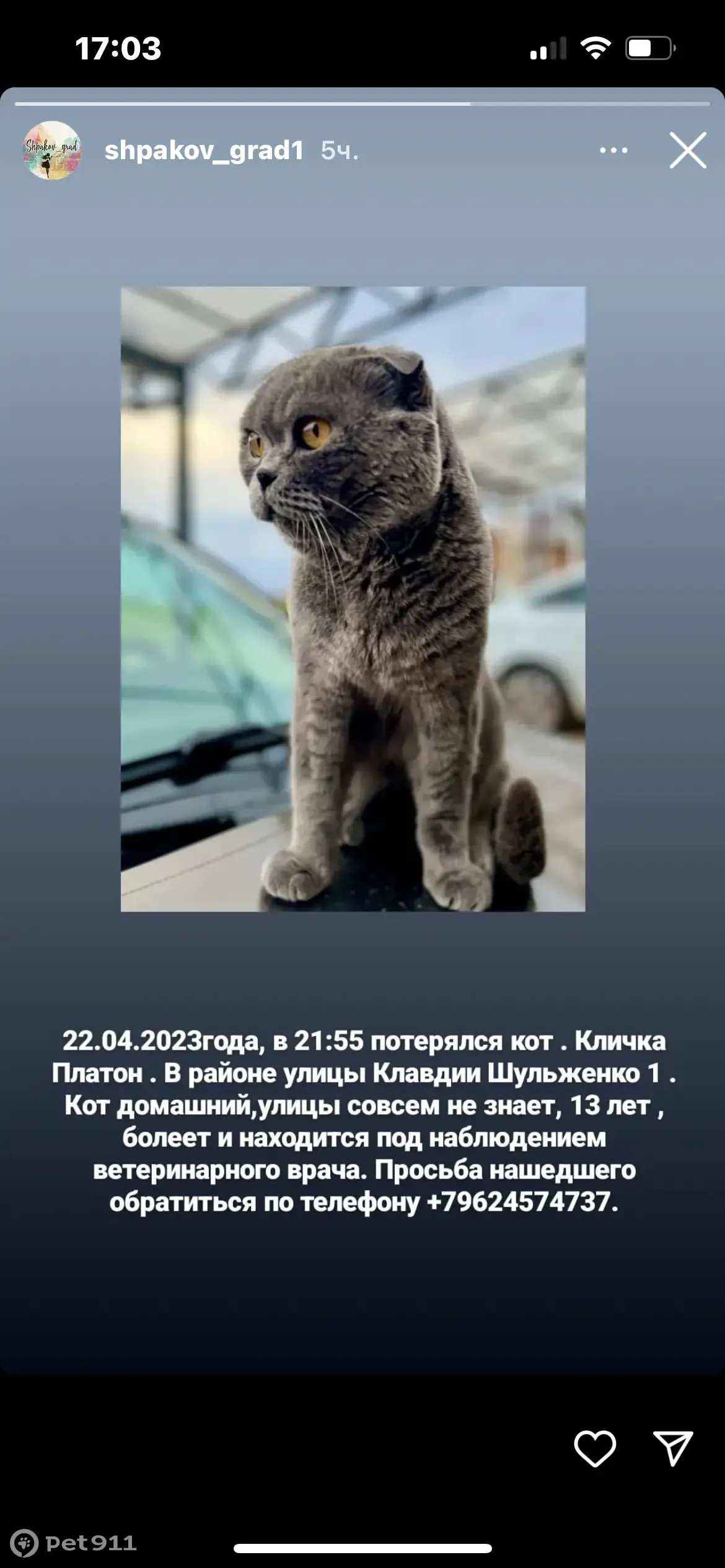 25.04.2023 г. пропал кот в районе перекрёстка...
