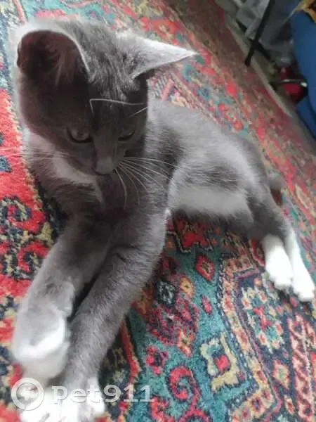 Окрас серый, брюшко и лапки белые. Выбежал из...