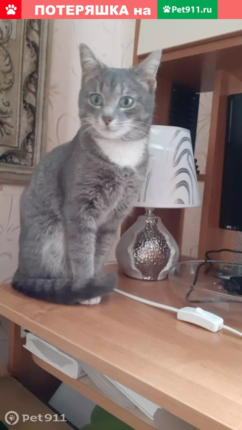 Пропал кот, окрас серый, на нем зелёный ошейн...