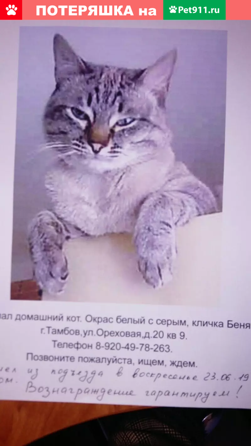 г.Тамбов Пропал кот в районе улицы Чичканова...