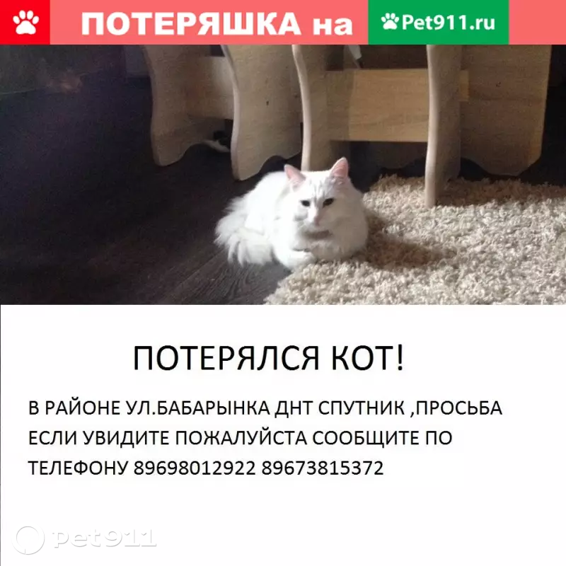 Потерян котик Беляшик в районе бабарынка днт...