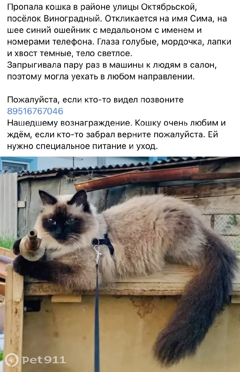 Кошки потеряшки, Виноградный, фото: Потеряшка кошка породы Невская маскарадная на Октябрьской улице, Виноградный: вознаграждение!