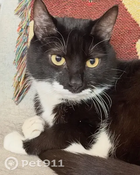 Черно-белый кот, гуляли со шлейкой. Гуляли в...