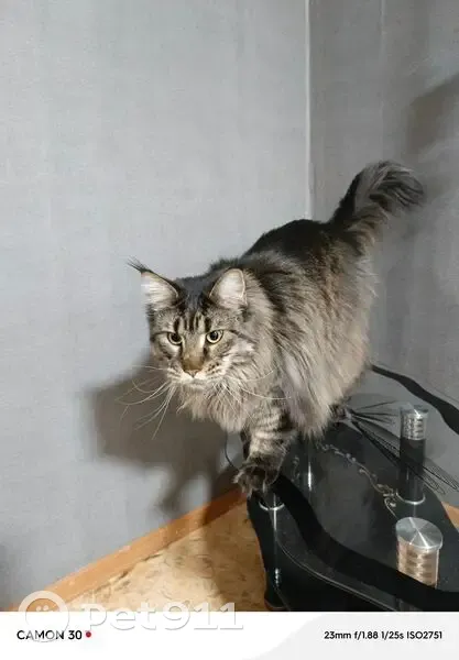 окрас серый, в полоску, глаза янтарно-желтые...