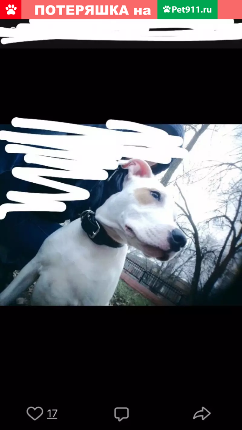 Пропала собака Порода Стафф,Окрас белый ,на...
