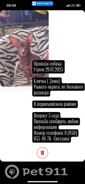 Пропала собака 29.07 Кличка ( Даша) Окрас рыж...