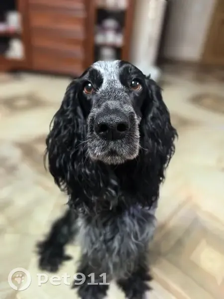 Русский спаниель. Чёрный, белая грудь. Перепр...