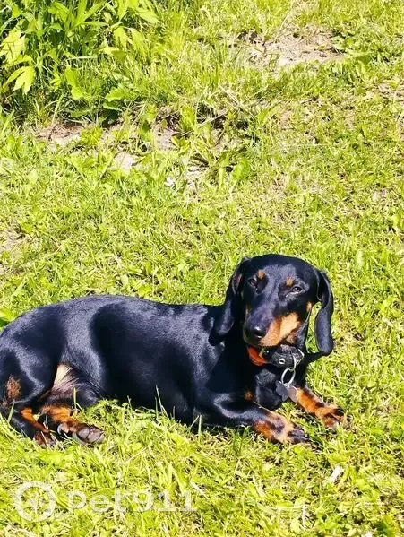 Такса ,Кличка Рэй. Окрас чёрный. На шее ошейн...