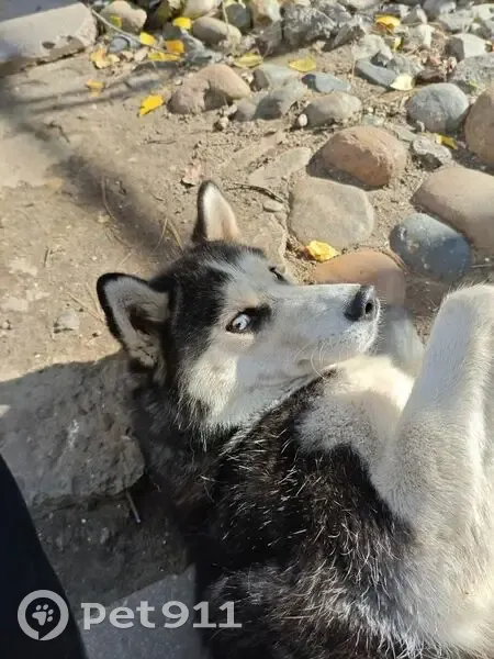 Черно белый окрас, хаски, на ошейнике номер т...