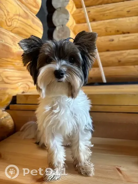 Маленькая белая собачка Бивер Йорк с чёрными...