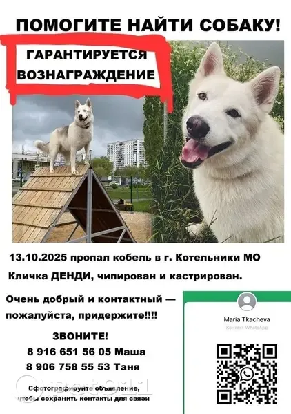 текст: Пропал кобель, Котельники МО Кличка Де...