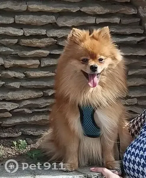 Рыжий шпиц девочка. На собаке синяя шлейка.