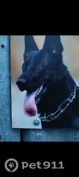 Темная шерсть. Жёлтый ошейник, красный жетон.