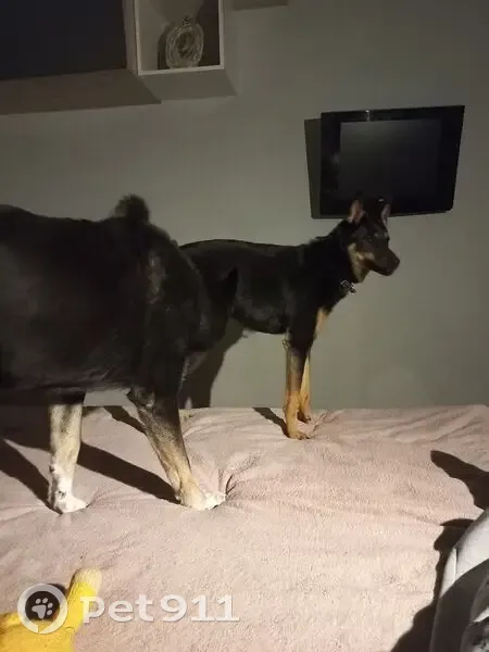 Чёрно-рыжая, на шее поводок черный и кусок ош...