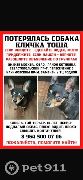 Той терьер, 14 лет, окрас черно-подпалый, сле...
