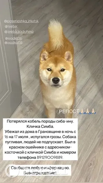 Потерялся кобель породы сиба-ину. Кличка Симб...