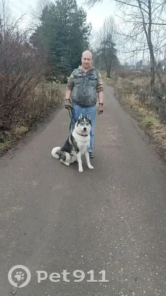 Метис хаски маламут. На шее адресник, на сине...