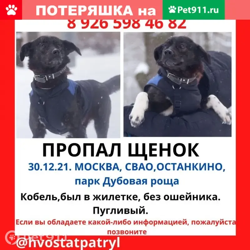 Пропал щенок, был в жилетке, пугливый