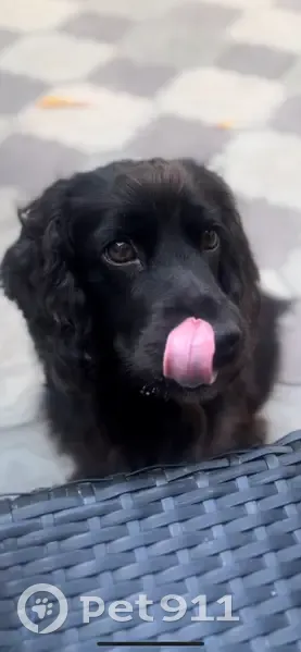 Черная собака породы спаниель на голове шишеч...